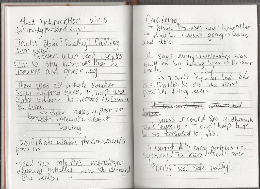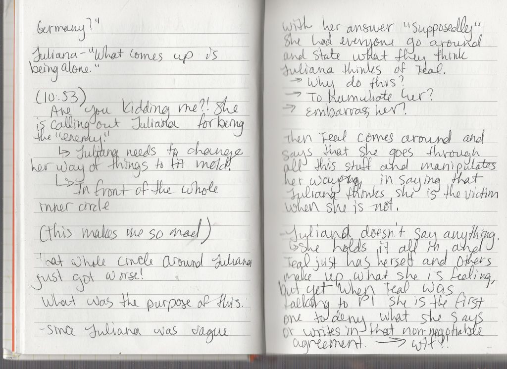 Right away after the redundant assembly the scene with the PI and Teal came to the surface. This scene was very intriguing to watch. I can tell that the PI had a difficult task in approaching the situation Teal about her tribe being a cult. The PI tried to be sensitive, but the conversation went south fast. Teal got very defensive when the PI started going through the list of the non-negotiables. Teal was denying and re-phrasing what she meant, and claimed she didn’t say any of the things that the PI was saying that that she said. From this interaction it confirmed to me really fast that Teal was trying to lie herself out of the negative light.